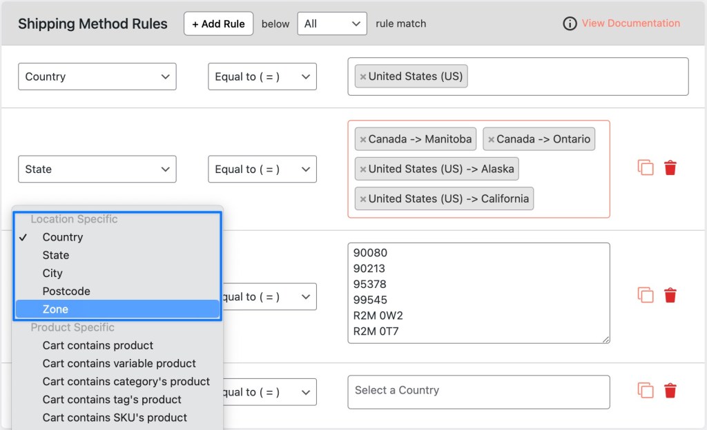 Apply shipping rules based on country, state, county, or zip code. Create an international flat-rate shipping method for your WooCommerce store with custom geographical zones. Identify popular shipping zones and set affordable shipping rates. Enable lower shipping rates for less popular shipping zones.